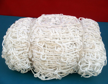 3. 再接下来是针车缝纫,先把织好的筒状网布进行裁剪,通常应量6.2m至6.5m,这样经过缝纫过后可保长度6m左右。缝纫时将绳子裹近网片边缘然后车在一起,绳子的重量和网片相适应,不宜轻或太重。绕着网片边缘缝2遍确保牢靠并把产品合格证车进去。